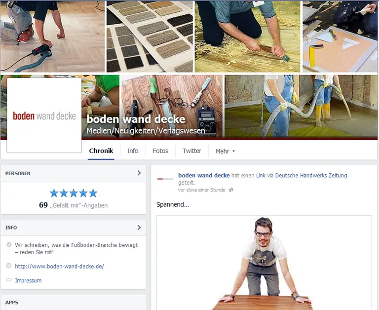 Sie wollten schon immer mal wissen, wie es hinter den Türen der Redaktion von boden wand decke aussieht? Sie möchten Ihre Meinung sagen, wenn es um aktuelle Themen aus Handwerk und Bodenbelagsbranche geht? Sie wollen immer aktuell informiert sein, wenn es etwas Neues gibt? Dann besuchen und liken Sie boden wand decke auf Facebook. Mit der neuen Seite möchten wir unseren Lesern, der Branche und allen Interessierten die Möglichkeit geben, Teil einer neuen Dimension des Informations- und Meinungsaustauschs in der Bodenbelagsbranche zu sein. Und das auf einer ganz persönlichen Ebene. Treten Sie in Kontakt mit der Redaktion, gestalten Sie aktuelle Diskussionen im Netz mit, sagen Sie uns was Sie bewegt.