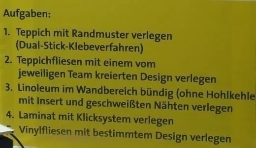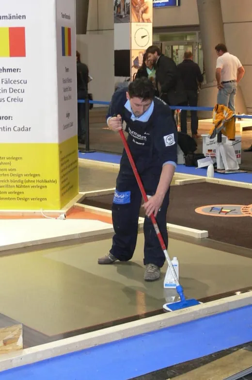 Genauigkeit und handwerkliches Geschick beim Verlegen von Teppichböden/-fliesen, Lino, Vinyl und Laminat gaben in den Augen der internationalen Juroren den Ausschlag für Italien. Auf die Plätze zwei und drei des von Torsten Grotjohann und seinem Koblenzer iff-Team organisierten Bewerbs kamen die Mannschaften aus Österreich und der Schweiz. Knapp dahinter landeten die deutschen Verlegeprofis Georg Michel, André Hänsch und Markus Leinfelder auf dem undankbaren Rang vier.