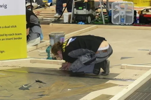 Dabei war der Start für alle Aktiven zunächst etwas holprig verlaufen. Als Unterboden war eine Hartfaserplatte installiert worden. Das Spachteln musste entfallen, ein angepasster Aufbau gewählt werden. Solch Unbill freilich steckten die Teilnehmer ebenso kurz entschlossen weg wie die Tatsache, dass die Ausstattung der Mannschaften mit Maschinen und Werkzeug durchaus voneinander abwich.