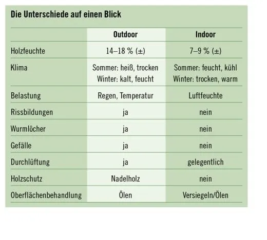 Insbesondere gilt es, diese Zusammenhänge auch deshalb zu beachten, weil massive Hölzer mit häufig sehr hoher Rohdichte und entsprechend hohen Quell- und Schwindmaßen eingesetzt werden. Eine vorherige HF-Messung ist deshalb bei Qutdoordielen zwingend erforderlich.