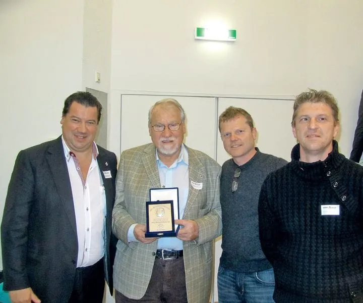 Alt-Innungsmeister Kommerzialrat Otto Mayrhofer war überrascht und gerührt über die nach ihm benannte Medaille, die ab sofort alle Meister mit Vorzug bekommen. Von links: Ing. Georg Mayrhofer, Otto Mayrhofer, Toni Spiegel, Christian Reiböck. - © Mayrhofer