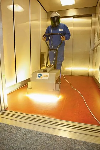 - 3. Schritt: Der Boden wird mit einer transparenten Schutzschicht lackiert. Mit der UV-Technologie kann der Handwerker den transparenten Lack sofort aushärten. Der aufgefrischte Boden verfügt nun über Rutschsicherheit sowie eine lange und hohe Beständigkeit vor mechanischem Abrieb und Kratzern, vor Desinfektionsmitteln sowie aggressiven, färbenden Substraten. Die Fugen werden hermetisch geschlossen, damit die Bodensanierung den aktuellen Hygiene-Standards entspricht. Die Oberfläche lässt sich nun laut Dr. Schutz mit deutlich geringerem Kosten- und Zeitaufwand reinigen und pflegen.