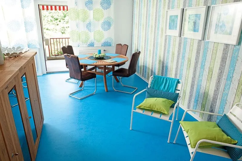 Im ersten Schritt sanierten die Handwerker Aufenthalts- und Wirtschaftsräume. Neben der Beschichtung mit transparentem PU-Siegel wurde der stark verkratzte PVC-Boden im Aufenthaltsraum nach den Wünschen der Hausarchitektin Michaela Prinz neu gestaltet. Passend zu dem zukünftigen Mobiliar wählte die Heimleitung die Bodenfarbe und das Bodenmuster aus. Zuerst entfernten die Handwerker die alten Pflegeschichten vollständig und rauten die Oberfläche zur Herstellung einer optimalen Haftbrücke an. Danach erfolgte der erste Lackauftrag in der von der Architektin gewünschten Farbe (RAL 9015) mit der Super-Profi-Rolle. Nach kurzer Trocknungszeit folgte der zweite Lackauftrag in einem anderen Blauton (RAL 9017) mit der Dekorwalze, um einen marmorierenden Effekt zu erzielen. Anschließend trugen die Handwerker als Decklack zum Schutz vor mechanischem Abrieb und Chemikalien ein PU-Siegel auf.