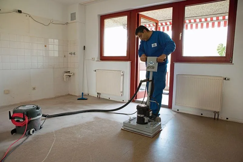 - 1. Schritt: Der Bestandsboden wird durch Grundreinigung und Anschleifen für den neuen Aufbau vorbereitet. Löcher, Kratzer und Beschädigungen werden ausgebessert und aufgefüllt.