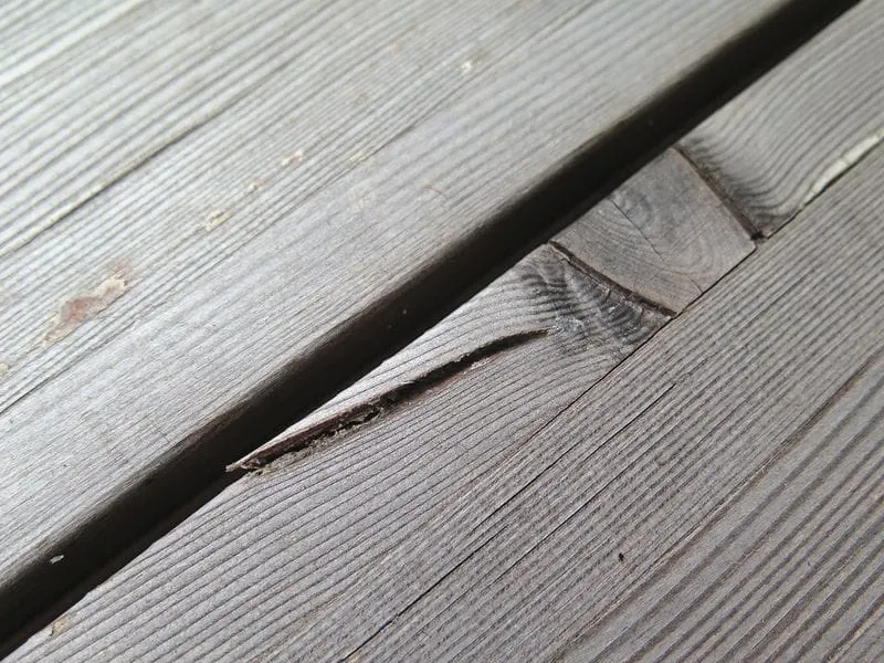 Einige Dielen wiesen oberseitig Risse auf, wobei kaum bis keine Holzablösungenoder aufstehende Partien erkennbar waren. Andere Elemente dagegen erschienen mit schräg/flach zur Oberfläche verlaufenden Risse n und gefährlichaufstehenden Holzschiefern. Diverse Äste fielen weg und daraus resultierten Löcher. Andere Äste lösten nur teilweise, standen der übrigen Fläche jedoch danach vor, was zu Stolper- wie auch Verletzungsgefahren führte, als Folge der scharfen Kanten und Splitter .