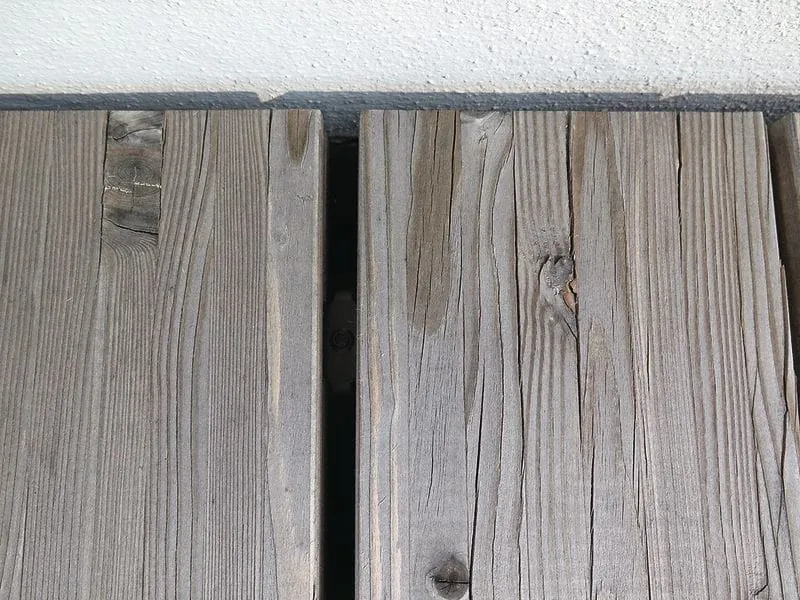 Leimfugen innerhalb der Terrassendielen brachen und daraus resultierten Fugenbildungen. Oft lagen mehrere Trennungen in Leimfugen je Element vor. Und die Öffnungen traten nicht nur stirnseitig, sondern auch innerhalb der Bretter auf.