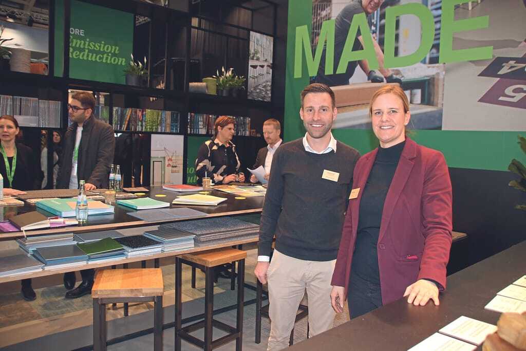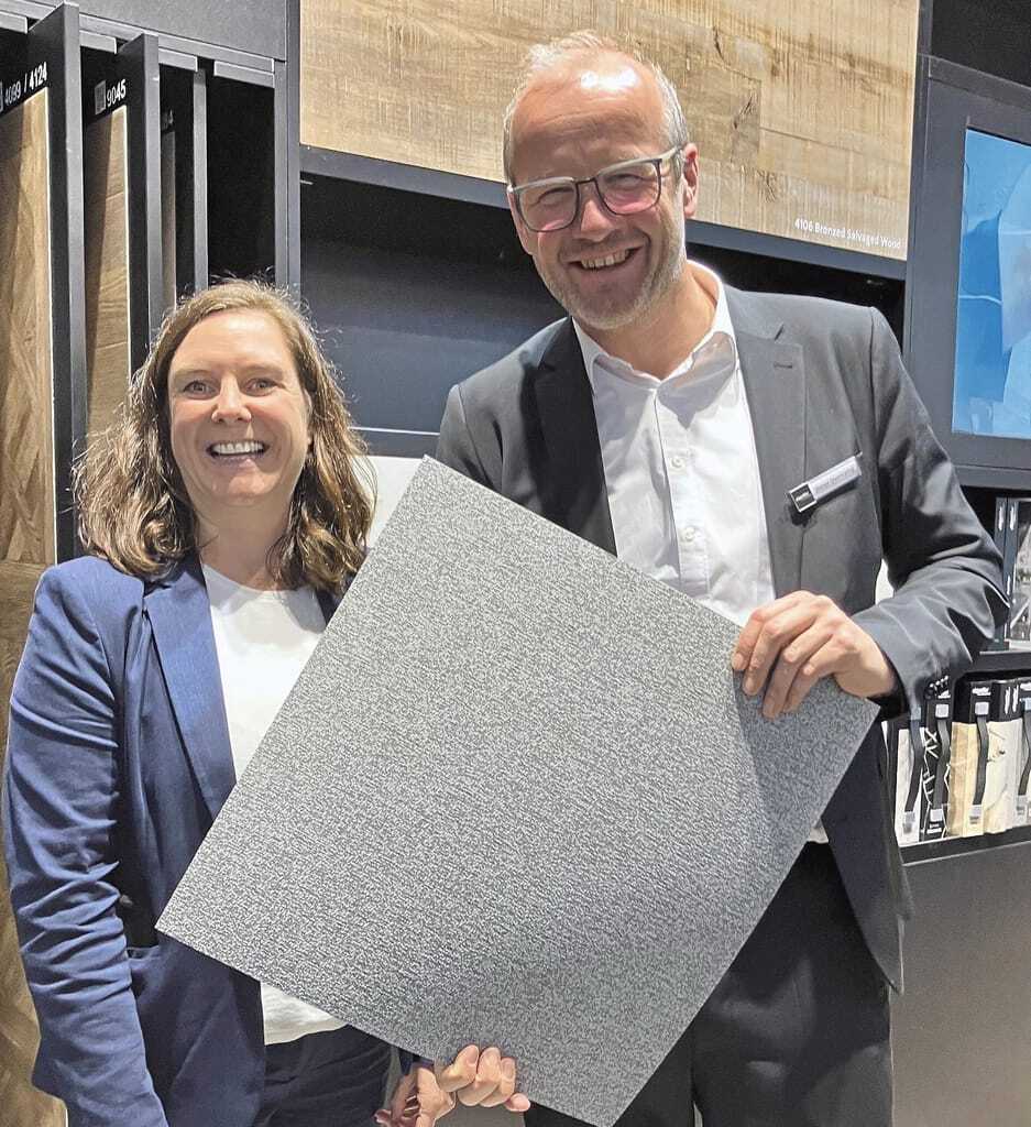 Am Stand von Interface und nora präsentierten Marketing Director Anne Salditt und Simon Knauf, Head of Regional Marketing nora DACH, den nach Angaben des Herstellers weltweit ersten CO2-negativen Kautschuk-Bodenbelag als Prototypen. Am Stand war eine schwarze Variante mit eingefärbten Granitsplittern zu sehen. - © bwd