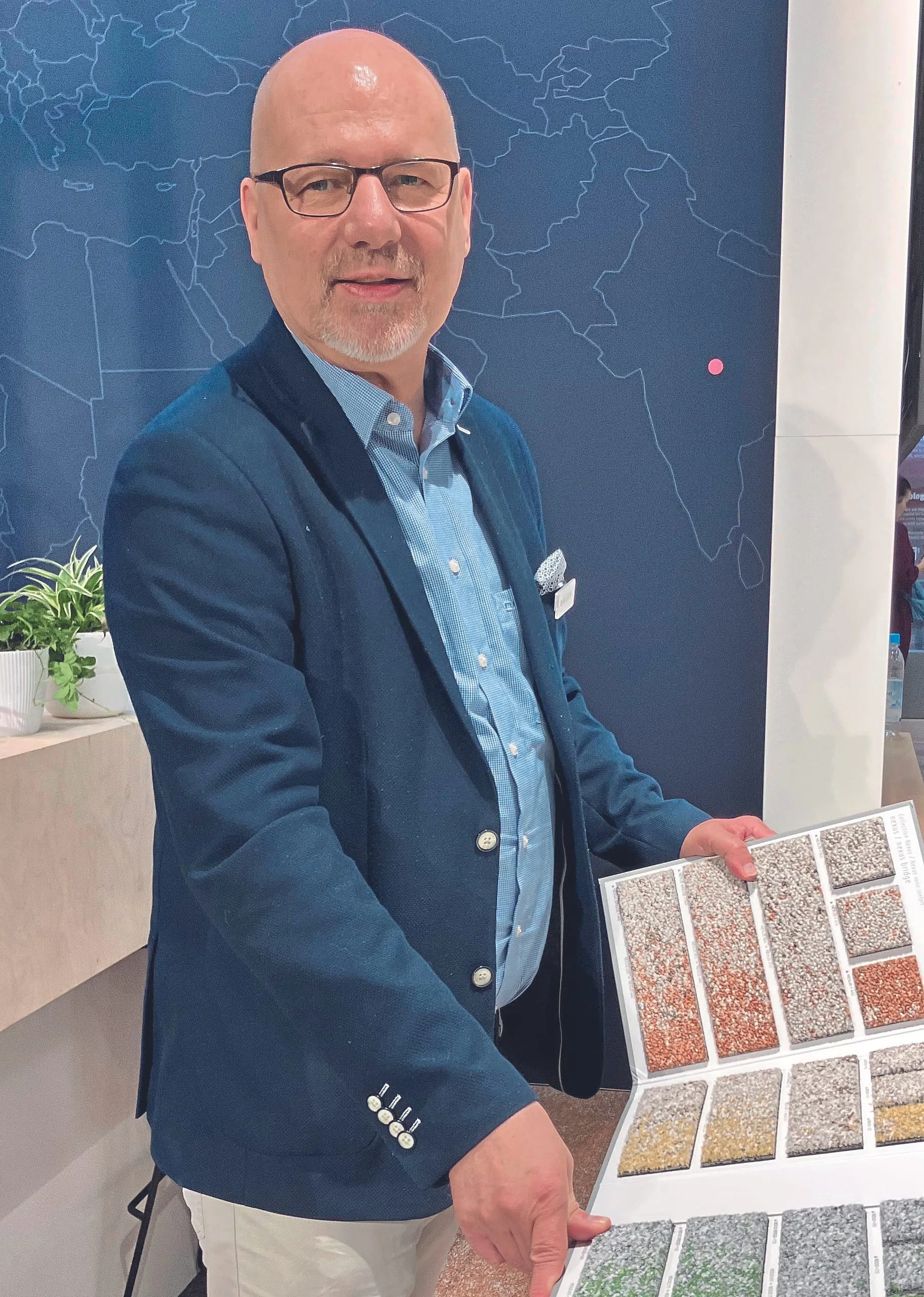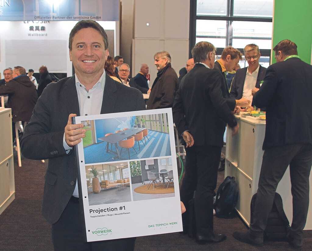 Die Hamelner Teppichwerke heißen seit Kurzem „Das Teppichwerk“. Der geschäftsführende Gesellschafter Tobias Arnold zeigte in München einen neuen Koffer mit Produkten für kleine bis mittelgroße Objekte, Projection #1, mit zwölf Qualitäten in 152 Farb- und Dessinpositionen. - © bwd