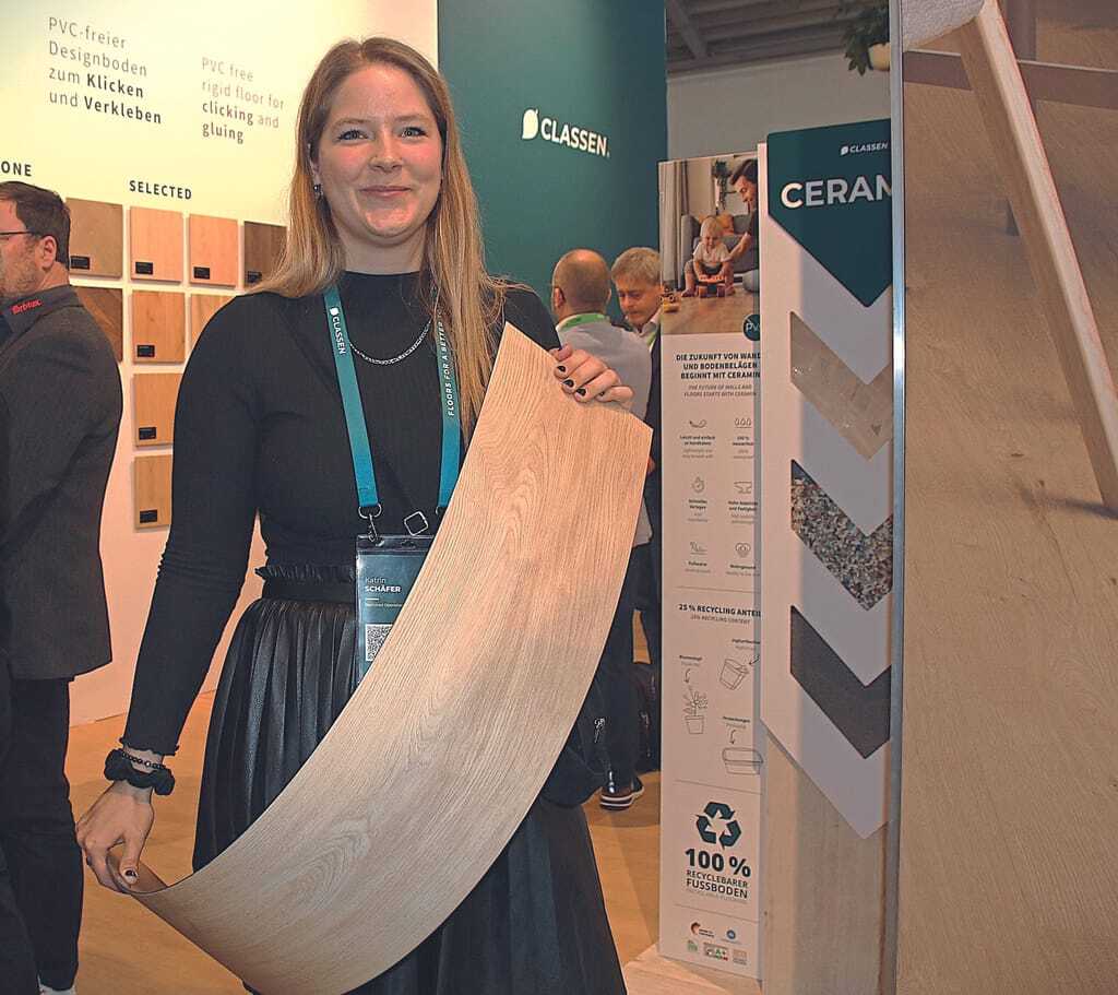 Katrin Schäfer, Teamleiterin Marketing bei der Classen Group, zeigte am Stand Ceramin in einer Looselay-Variante. Der Bodenbelag kommt im Laufe des Jahres auf den Markt und ist zum Beispiel für den Ladenbau ein Thema. Ceramin ist ein PVC-freier Belag auf Polypropylen-Basis. - © bwd