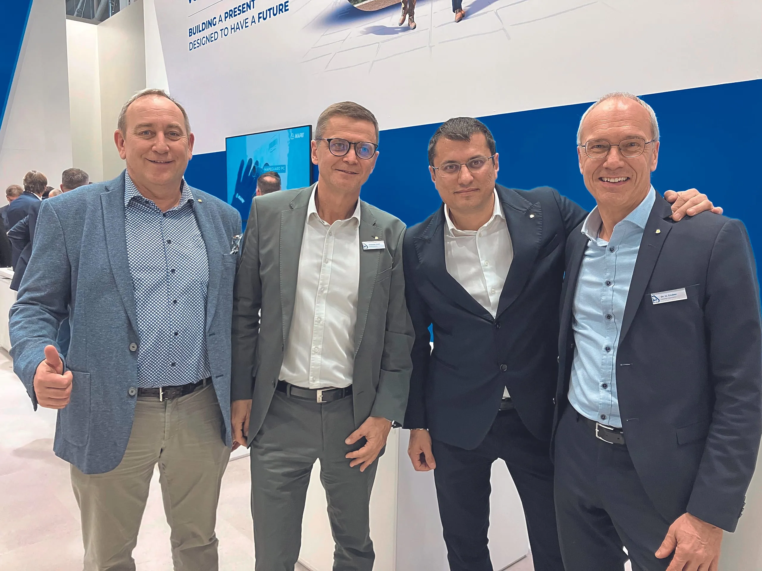 Länderübergreifende „Elefantenrunde“ (von links): Mapei-Schweiz-Geschäftsführer Martin Schneider, -Österreich-Geschäftsführer Andreas Wolf, Mapei-Eigentümer Marco Squinzi und Mapei-Deutschland-Geschäftsführer Dr. Uwe Gruber. - © bwd