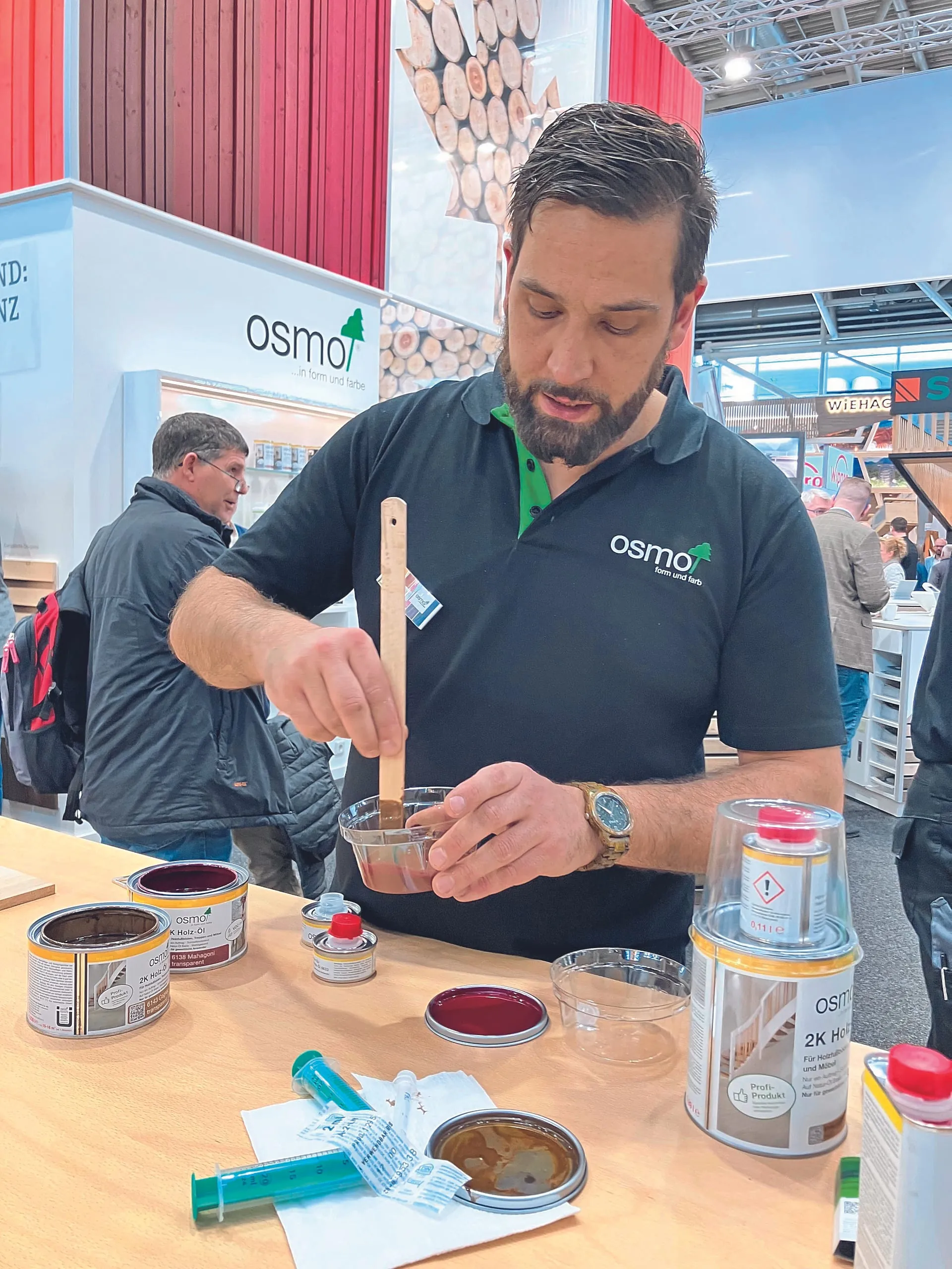 Osmo spendierte seinem 2-K-Holzöl den neuen Farbton „Mahagoni“. Auf der BAU demonstrierte die Anwendungstechnik einmal mehr die vielseitige Oberflächenkompetenz des Warendorfer Spezialisten. - © bwd