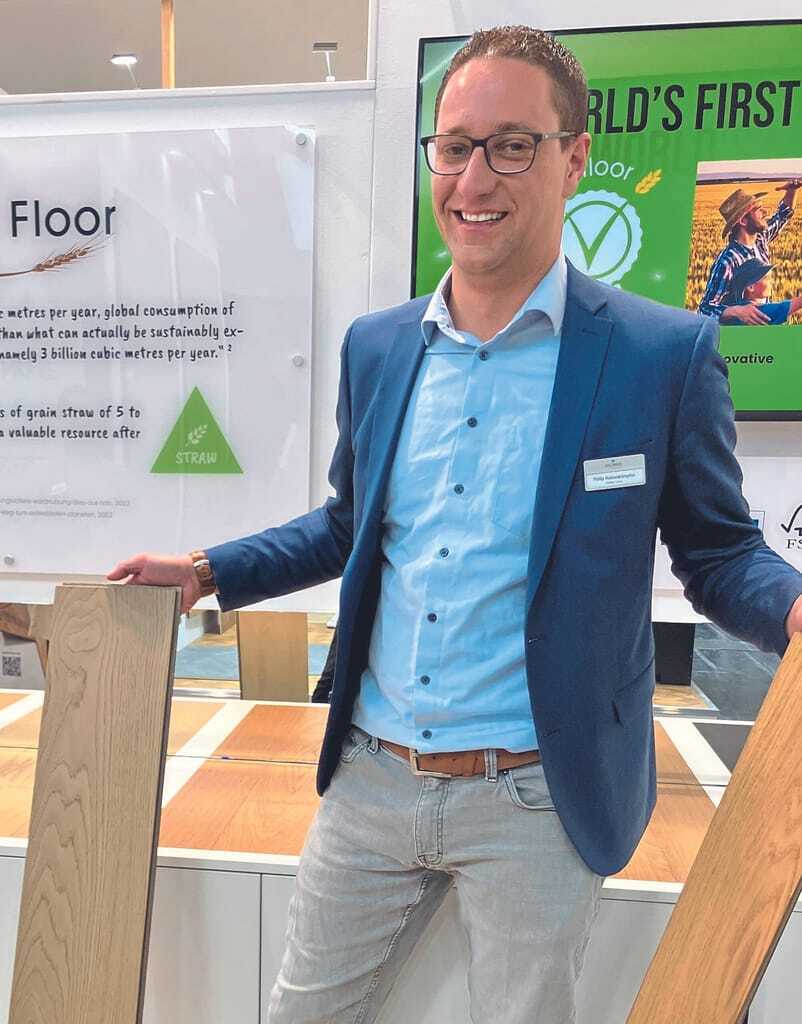 Koczwara reklamierte auf der BAU zwei Weltneuheiten für sich: den Strohboden Jangal und mit „Check smart tile“ die erste „Steinfliese“ zum Klicken. Im Bild Verkaufsleiter Philip Holzenkämpfer - © bwd