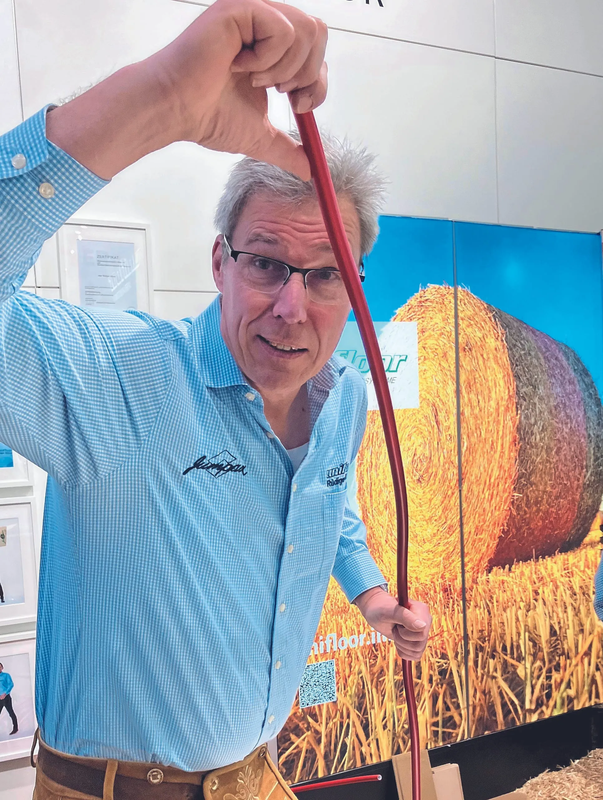 Rüdiger Dicke zelebrierte auf der BAU die vielfältigen Unifloor-Lösungen für Fußbodenheizsysteme. Ganz neu und für Bodenleger interessant: Die e-Box, ein vorkonfektioniertes Set für elektrische Fußbodenheizungen. - © bwd