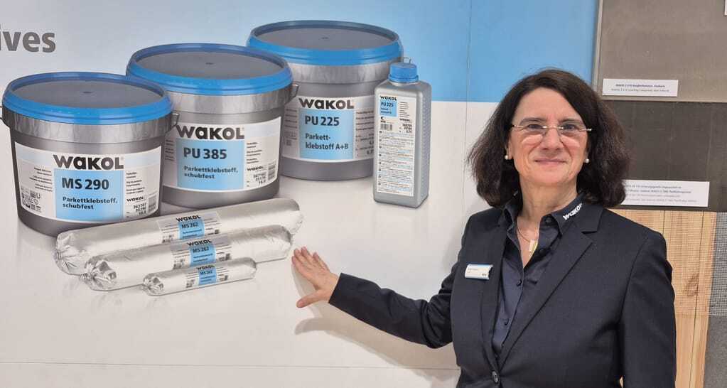Birgit Hansen (Marketing) stellte den nachhaltigen Parkettklebstoff MS 290 aus dem breiten Sortiment an Verlegewerkstoffen von Wakol vor. Der Hersteller hat zu all seinen Produkten Nachhaltigkeitsdaten erstellt, wobei die Klassifzierung EC 1 Plus für die meisten Produkte selbstverständlich sei. - © bwd