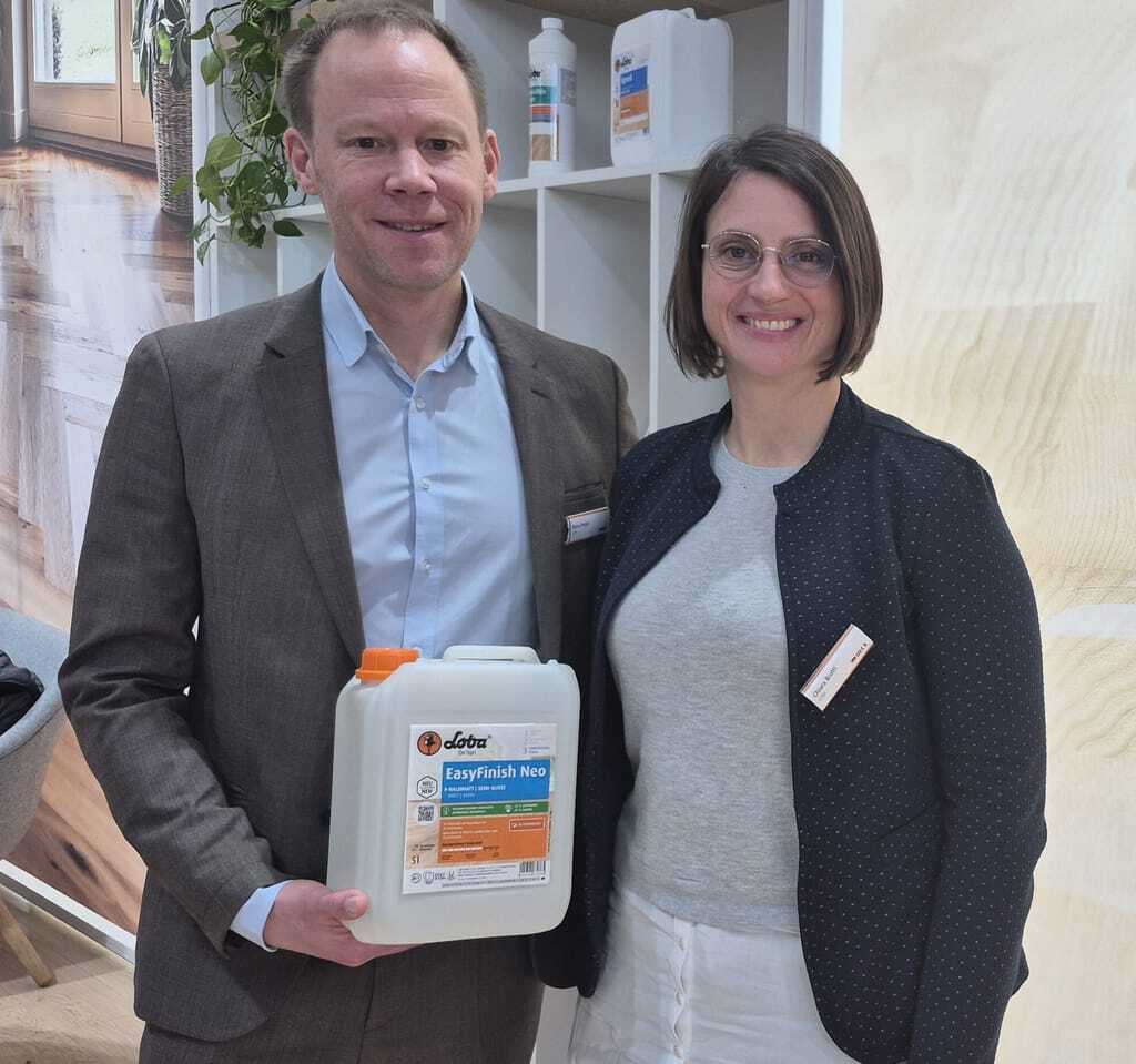 Loba-Geschäftsführer Mario Probst und Chiara Brutti (Leiterin Marketing & Kommunikation) freuen sich über ein Umsatzplus von sechs Prozent, das der Oberflächenspezialist im letzten Jahr erzielen konnte. Im Mittelpunkt der Präsentation standen der neue 1K-Parkettlack Speed und EasyFinish Neo mit seiner besonderen Rezeptur auf Basis nachwachsender Rohstoffe. - © bwd