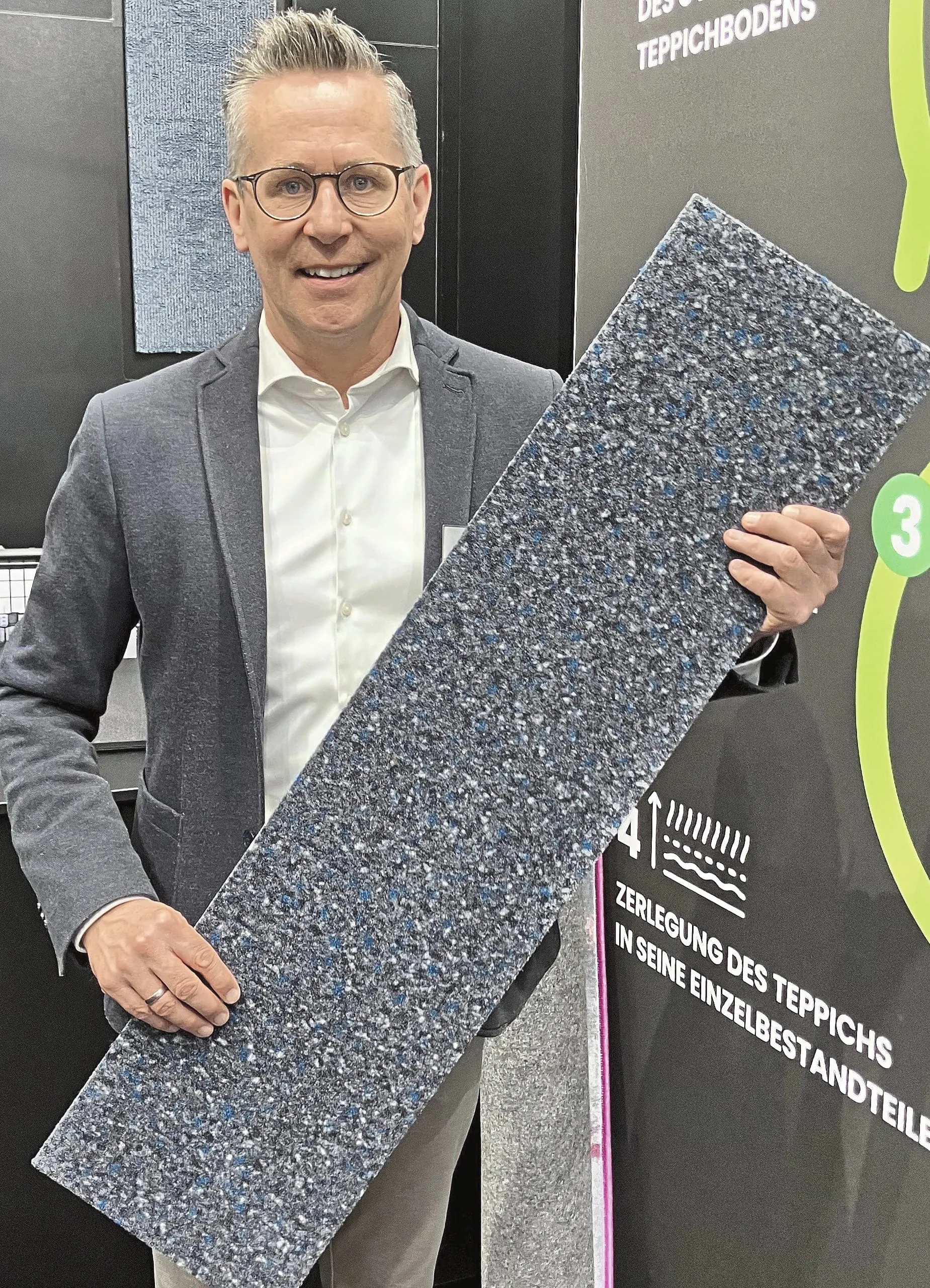 „Wir verzeichnen bei modularen Belägen seit sieben Jahren kontinuierllich Zuwächse und realisieren inzwischen damit über 50 Prozent unseres Umsatzes“, sagt Christian Grube, Verkausleiter bei Infloor. Auf der BAU stellte Infloor mit „Scoop“ einen komplett (Garn, Rücken, Träger) kreislauffähigen Teppichboden vor. - © bwd