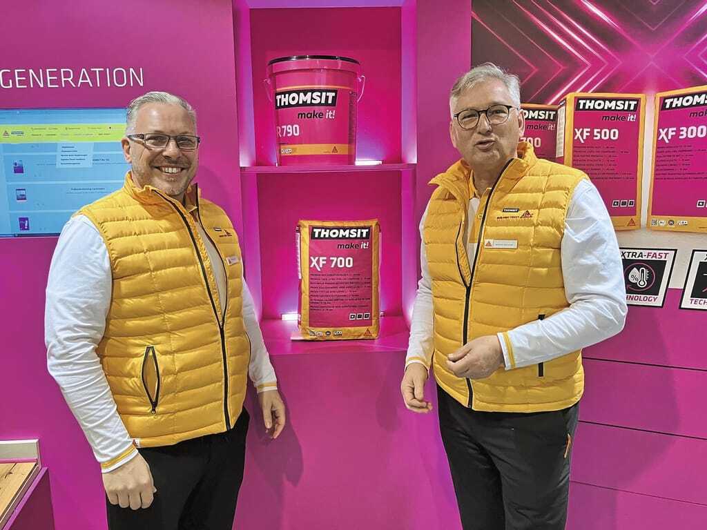Magenta und Gelb. An diese Farbkombination haben sich Wolfram Schreiner (rechts) und Thorsten Zick längst gewöhnt. Unter dem „One Sika“-Dach präsentierten neben Thomsit auch PCI und Schönox zahlreiche Neuheiten für das bodenlegende Handwerk. - © bwd