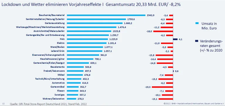 Das Sortiment „Wand/Boden“ musste 2021 gegenüber Vorjahr ein Umsatzminus von -5 Prozent hinnehmen auf 1.077,1 Mio. Euro. Die Umsätze im Segment „Bauchemie/Baumaterial“ gingen um -4,4 Prozent auf 2.342 Mio. Euro zurück. Im Bereich „Fliesen“ sanken die Umsaätze um -7,1 Prozent auf 343,3 Mio. Euro. „Anstrichmittel/Malerzubehör“ verbuchte ein Umsatzminus von besagten -18 Prozent auf 1.323,8 Mio. Euro.