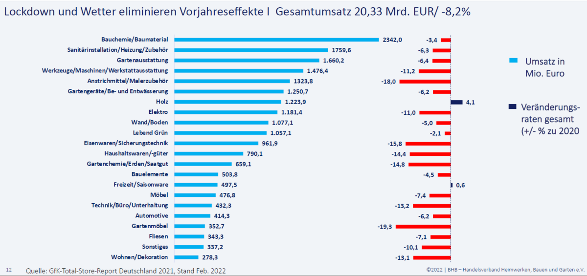Auch in der Sortimentsentwicklung zeigt sich die volatile Situation sehr deutlich. Auch hier verglichen mit einem enorm starken Vorjahr – mit zweistelligen prozentualen Zuwächsen in fast allen Bereichen – stellt sich nun vieles wieder auf „Normalmaß“ um. Mit Holz (+4,1%) und Saisonwaren (+0,6%) sind tatsächlich nur zwei Produktbereiche überhaupt im Plus. Stärkste Rückgänge verzeichnen in Deutschland besonders die Bereiche Gartenmöbel (-19,3%) Anstrichmittel/ Malerzubehör (-18,0%) und Eisenwaren/Sicherungstechnik (-15,8%).