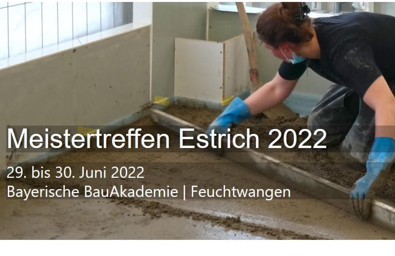 Die Bayerische BauAkademie veranstaltet vom 29. bis 30. Juni 2022 in Feuchtwangen ein Meistertreffen Estrich. Während der zweitägigen Veranstaltung mit Fachvorträgen, einer Sponsorenausstellung und Möglichkeit zum Netzwerken, dreht sich alles rund um Estrich und Boden.