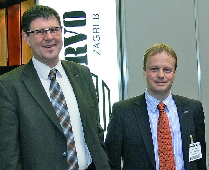 1 Im Messegespräch: E-Sign-Geschäftsführer Frank Schmied (links) und Karsten Strenge, Exportmanager des deutschen Parkettherstellers Jaso, der sich auf einem Gemeinschaftsstand des Parkettgroßhandels Albers präsentierte.