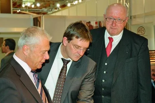 © HeinzeSteffel-Austria-Geschäftsführer Victor Jackl zeigt Objectflor-Geschäftsführer Stephan Wolf und Eberhard Lotz Kollektionsneuheiten. -
