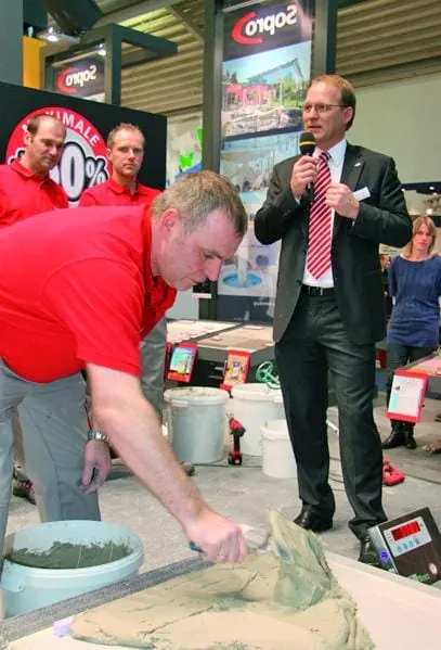 © KoberAnziehungspunkt: Die von Anwendungstechnikchef Mario Sommer moderierten Sopro-Praxisvorführungen sorgen für volle Gänge in der Münchner Bauchemiehalle.