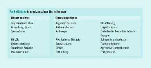 Parkett und Krankenhaus sind beileibe kein Widerspruch. Allerdings muss man genau differenzieren. Welche Anforderungen werden in welchen Bereichen an den Boden gestellt? Wo kann Parkett diese Anforderungen erfüllen, wo nicht?