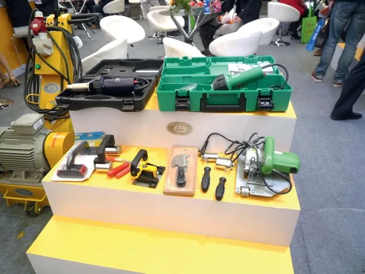 An einem weiteren Stand wurden akkubetriebene, tragbare Kreissägen mit integrierter Staubabsaugung angeboten. Diese Sägen wären für die Laminat- und Parkettverlegung auf den ersten Blick bestimmt sehr hilfreich. Doch beim näheren Hinsehen sah man deutlich, dass der Sicherheitsstandard nicht den europäischen Gepflogenheiten entsprach. Auch beim bestimmungsmäßigen Gebrauch der Säge wäre es ein leichtes gewesen, sich mal schnell einige Finger abzusägen. Also aus Sicht eines Parkett- und Bodenlegers haben wir nichts an Werkzeug gesehen, was es bei uns nicht auch schon gäbe. Technologisch hatten wir den Eindruck, dass die Chinesen so etwa ein Jahrzehnt hinter uns zurück sind.