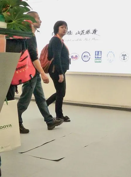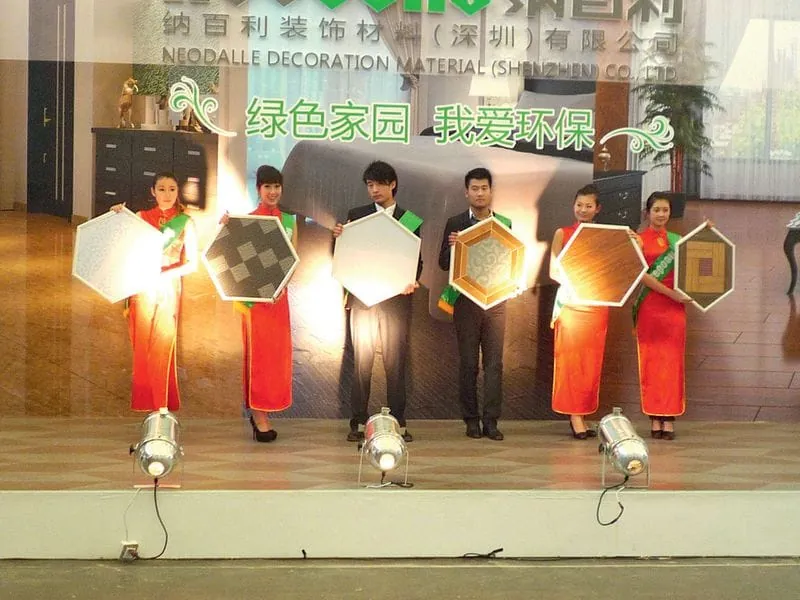 Am nächsten Tag ging es zur Messe und das, wie wir schnell gelernt hatten, am besten mit dem Taxi. Der Kilometer Taxifahrt kostet umgerechnet 30 Cent. Der Eintritt zur Messe ist für Ausländer frei, Chinesen müssen einen kleinen Obolus bezahlen. Ansonsten, um es vorwegzunehmen, die Domotex Asia ist vergleichbar mit der Domotex Hannover, nur insgesamt kleiner und ohne die Hallen mit den „echten“ Teppichen. In den ersten Hallen, die wir durchwanderten, waren hauptsächlich Parkett- und Laminatböden ausgestellt. Was wir in diesen Hallen schnell gelernt haben: Auf jeden Fall direkten Blickkontakt mit dem Personal auf den Ständen vermeiden. Bei einem direkten Blickkontakt oder bei einem angedeuteten Interesse für die ausgestellten Produkte kamen die Verkäufer direkt auf uns zu und wollten uns in diverse Verkaufsgespräche verwickeln.
