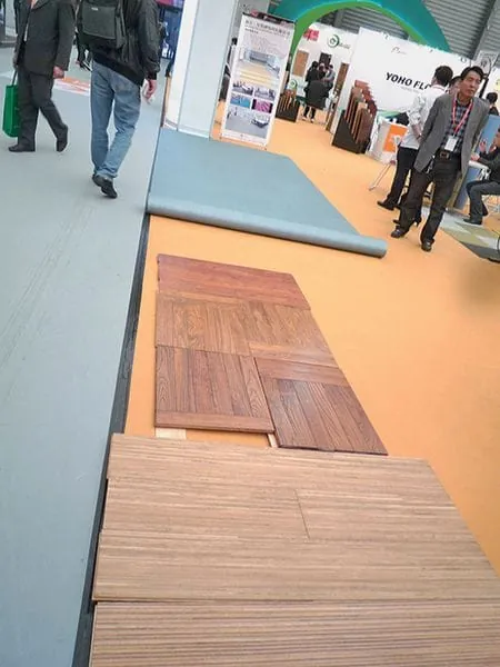 Und ist aufgefallen, dass die Chinesen ein sehr viel entspannteres Verhältnis zu den Bodenbelägen haben als wir Deutschen. Auf den Messeständen hatten die Aussteller überhaupt kein Problem damit, ihre Holzböden auf einem mit Teppichboden ausgelegten Stand zu präsentieren. Bei den PVC- und Designbelagsherstellern verhielt es sich ähnlich. Für die chinesischen Aussteller war es auch kein Grund, sich zu erschießen, nur weil ein Parkettboden mal ein paar Fugen zeigte.
