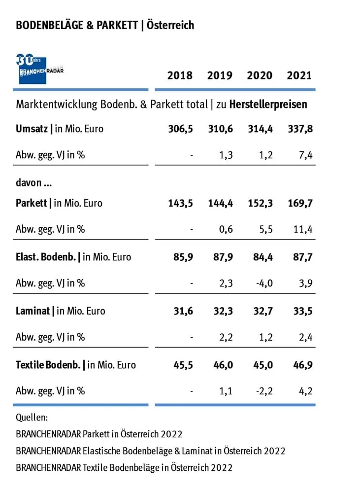 Der österreichische Markt für Bodenbeläge und Parkett wuchs im Jahr 2021 auf breiter Front. Die entscheidenden Wachstumsbeiträge kamen von Parkett, zeigen aktuelle Daten des Marktforschungsinstituts Branchenradar.com Marktanalyse.