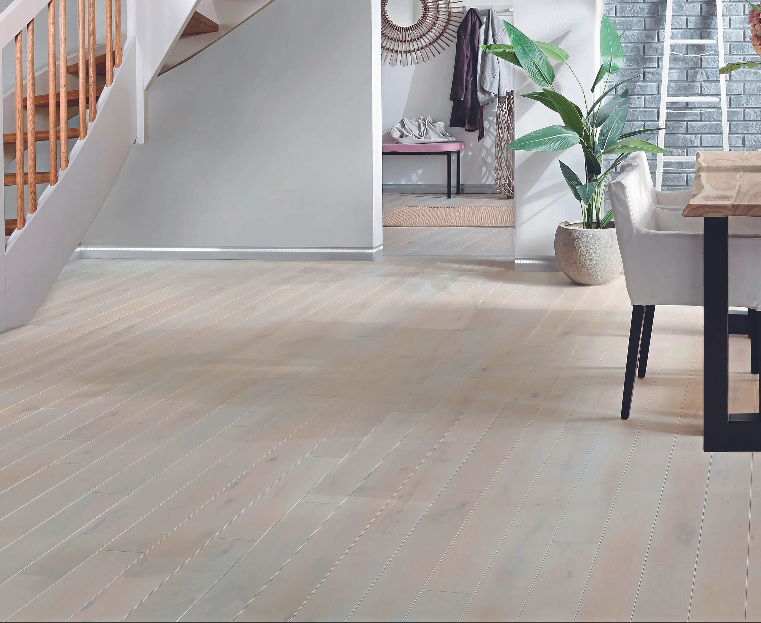 Bei Holzbodenbelägen sind die Möglichkeiten der Veredelung besonders vielfältig: Gekälkte Böden, gebürstete und geschroppte Beläge, lackierte, gebeizte oder geölte Oberflächen – das kennt auch der Endverbraucher und entwickelt entsprechende Begehrlichkeiten. Eine schöne Maserung ist es wert, hervorgehoben zu werden. Und gut geschützt sollte sie ebenfalls sein. Öle und Lacke sind in vielen Varianten und Farbtönen zu haben. So wird ein Parkettboden nicht nur schöner, sondern auch rutschfest und weniger empfindlich zum Beispiel gegenüber Wasserflecken. Einige solcher Maßnahmen lassen sich wieder rückgängig machen, andere nicht, etwa wenn weichere Bestandteile des Holzes entfernt wurden.
