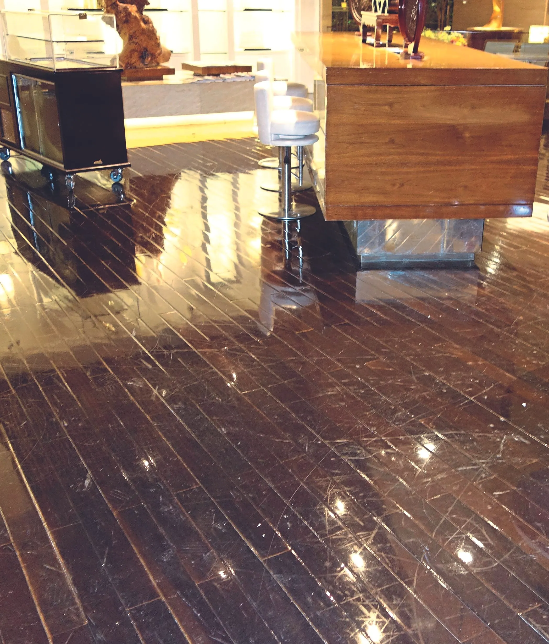 Oft muss ein Boden bei laufendem Betrieb veredelt werden, etwa in der Gastronomie, im Krankenhaus, im Retail-Segment. Das klappt, aber mit Einschränkungen, meint Ralf Edelmann: „Die Sanierung erfordert eine gewisse Ausfallzeit – diese ist jedoch meist auf wenige Tage begrenzt und häufig sogar nur auf wenige Stunden.“ Mit UV-härtenden Systemen gehe es sogar noch schneller: „In besonders sensiblen Bereichen wie Krankenhäusern oder Notaufnahmen kann durch UV-Aushärtung die Fläche direkt nach dem Auftrag beziehungsweise dem Belichten mit der UV-Lampe wieder zu hundert Prozent genutzt werden. Bei kleinen Flächen ist eine Sanierung meist innerhalb eines Tages möglich.“