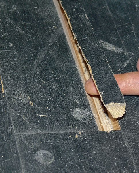 Dann untersuchte er den Boden genauer. Oberflächlich war bei dem schwarz eingefärbten Boden nur unzureichend zu erkennen, ob und in welchem Umfang Riftdielen verarbeitet wurden. Daher nahm der Gutachter die umlaufenden, flach auf den Boden genagelten Fußleisten auf. Um zu erkennen, wie der Jahrringverlauf der eingesetzten Dielen war, nahm er einen flachen Spiegel zur Hand und schob ihn in die offene Randfuge. Jetzt war deutlich der Hirnschnitt der Dielen mit den entsprechenden Jahrringwinkeln erkennbar. Dabei fand der Sachverständige alle möglichen Lagen, selbst liegende Jahrringe waren darunter. In der Fläche machte er eine Reihe von Elementen aus, die deutliche Rissbildungen zeigten. Auch Bereiche, in die die beiden Schauspieler zur Abgrenzung von Bühnenflächen Klebebänder aufgeklebt hatten, zeigten mehrere Millimeter tiefe Holzausrisse.