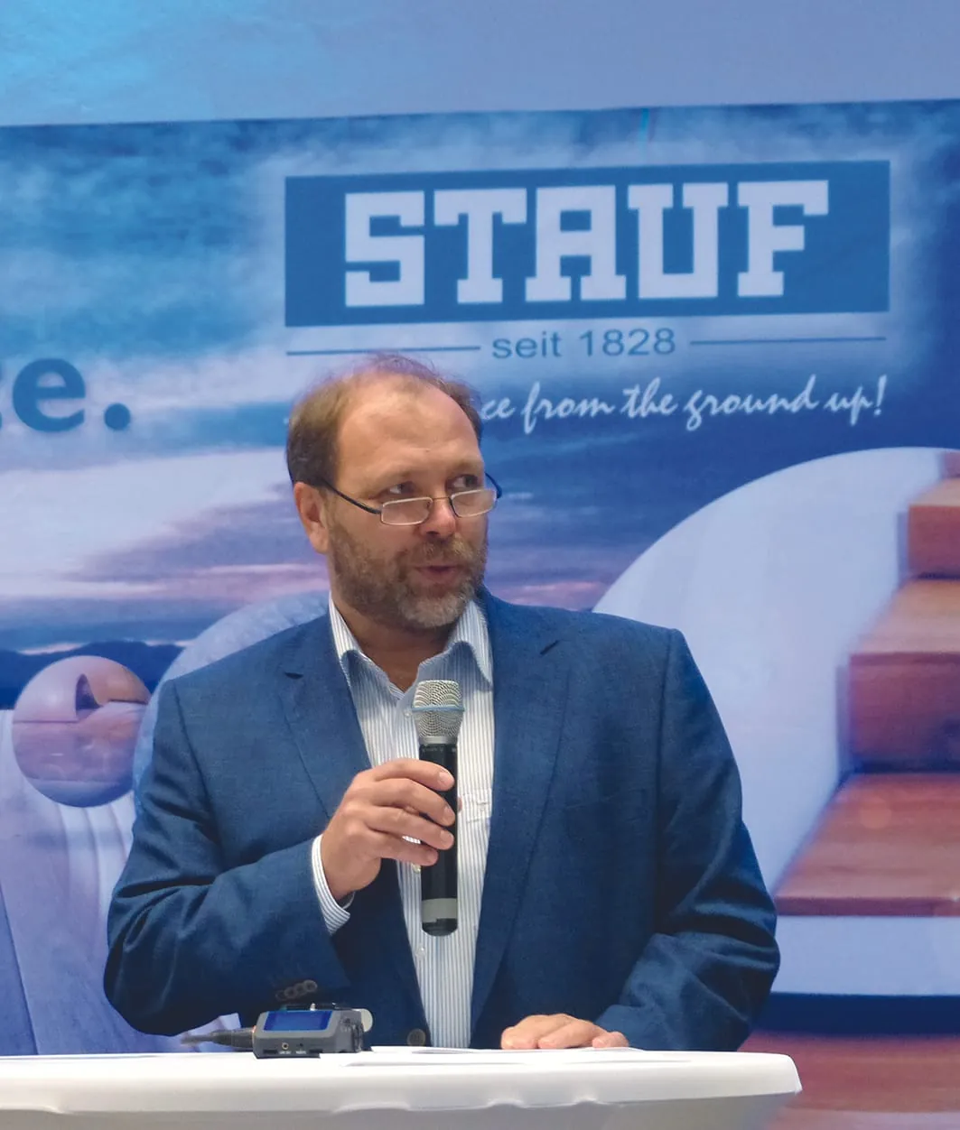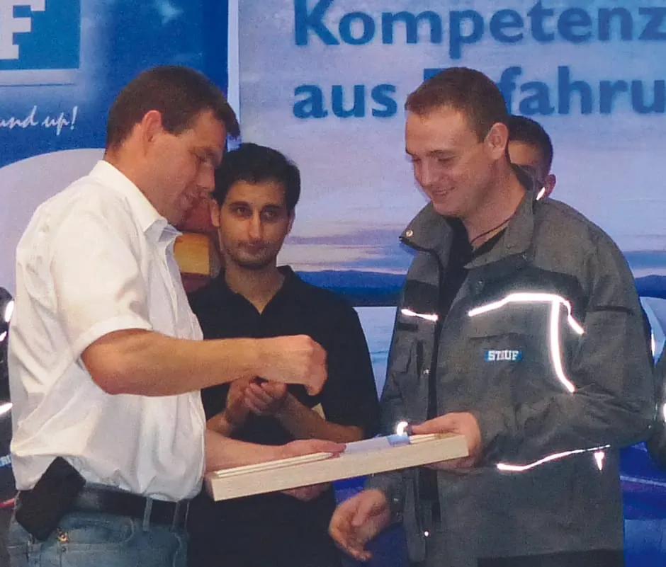Stauf hatte eigens mit Bussen die Jugendlichen in deren Berufsschulen abgeholt, um bei der „Olympiade der Berufsausbildung“ (O-Ton Peter Fendt) dabei zu sein. Volker Stauf, kaufmännischer Geschäftsführer des Unternehmens, lobte am Ende die technische und kreative Vielfalt aller Teilnehmer. Es gelte, den Gedanken eines solchen Wettbewerbs auch an die Endverbraucher zu tragen. Ein erster Schritt in diese Richtung war mit der Teilnahme der Öffentlichkeit an der Veranstaltung gemacht. Bundesinnungsmeister Fendt nutzte die Gelegenheit, über die Zukunft nachzudenken. „Wo sind die Meister von morgen?“, fragte er in Zeiten des Facharbeitermangels und der nicht erfüllten Hoffnung der Politik auf steigende Ausbildungsplätze nach der letzten Handwerksreform 2004. Die Zahl der Betriebe hätte sich vervierfacht, bei einem Rückgang an Auszubildenden von 60 Prozent. Bezogen auf die Berufsausbildung betonte er, dass ein Kleingewerbe, wie es die Parkett- und Bodenleger sind, die Unterstützung aus der Industrie benötige, wobei die gemeinsame aktuelle Nachwuchskampagne eine wegweisende Plattform für die Berufswahl darstelle. Die Neuausrichtung der Fachgruppe Aus- und Weiterbildung im Zentralverband sei ein wichtiger Schritt nach vorn. Doch im Vordergrund dieses Tages standen die jugendlichen Landessieger der Verbände (jeder von ihnen hat übrigens ein Anrecht auf 3.000 Euro an das Bundesbildungsministerium, die an eine Weiterbildungsmaßnahme gebunden sind).