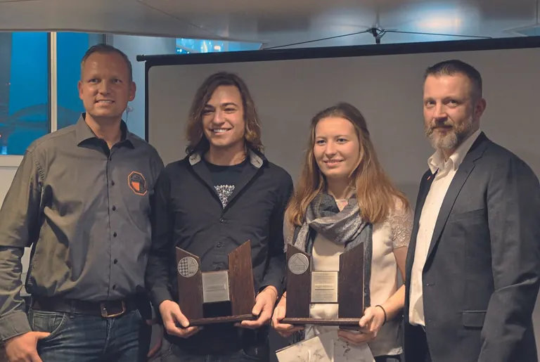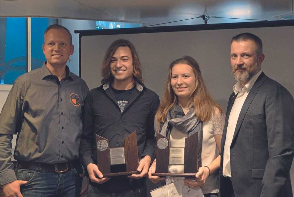 Bodenleger Leonhard Lehner (Zweiter v.li.) und Parkettlegerin Regina Fraunhofer (Dritte v.li.) waren die Sieger des Bundesleistungswettbewerbs 2019. - © Kittnar