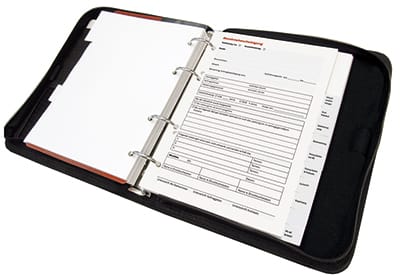 Das Ringbuch im Format Din A5 (4-fach-Lochung) ist aus widerstandsfähigem Nylon und kann rundum mit einem Reisverschluss verschlossen werden. Zur Ermittlung der Fugendichten ist eigens ein Lineal integriert.