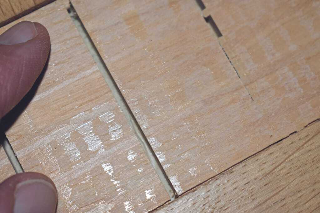 - An einer Prüfstelle im Wohnzimmer zeigte sich ein besonders großer Überzahn (> 1,0 mm). Hierbei zeigte sich bei weitergehender Inspektion, dass sich dieser Überzahn mehr oder weniger über die gesamte Länge des Einstabparketts darstellt. Schließlich war es möglich, den Überzahn des Parketts soweit zu erhöhen, dass ein Rissbreitenmaßstab in einen Fugenspalt eingeführt werden konnte. Dergestalt ließ sich die obere Decklage des Fertigparketts ablösen.