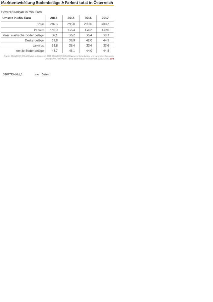 2017 war ein gutes Jahr für Hersteller von Bodenbelägen und Parkett. Erstmals seit acht Jahren konnte die Nachfrage wieder ausgeweitet werden. Das zeigt eine Marktstudie von Branchenradar. Im vergangenen Jahr stieg der Absatz um zwei Prozent auf rund 19,4 Millionen Quadratmeter. Angeschoben wurde der Markt im Wesentlichen vom Neubau, sowohl von Wohnungen als auch von Büro- und Verwaltungsgebäuden. Dank steigender Preise bei den Produktgruppen Parkett, heterogene PVC & Vinyl sowie Linoleum erhöhten sich die Herstellererlöse noch etwas rascher um 3,5 Prozent gegenüber dem Vorjahr auf 300 Millionen Euro. Dadurch kam es im vergangenen Jahr selbst bei Laminat zu einer Trendwende: Der Herstellerumsatz stieg moderat um 0,6 Prozent gegenüber 2016 auf 33,6 Millionen Euro. Der Umsatz mit textilen Bodenbelägen erhöhte sich um 1,8 Prozent auf 44,8 Millionen Euro. Parkett entwickelte sich erlösseitig synchron mit dem Markt (+3,6 Prozent gegenüber dem Vorjahr), die Erlöse stiegen somit auf 139 Millionen Euro. Am dynamischsten entwickelten sich allerdings einmal mehr elastische Bodenbeläge, allen voran Designbeläge. Der Marktumsatz kletterte auf insgesamt 82,8 Millionen Euro. Bei klassischen elastischen Bodenbelägen betrug das Umsatzplus 5,2 Prozent, bei Designbelägen sogar 6,2 Prozent. Das entscheidende Verkaufsargument für Designbeläge war zweifelsohne weiterhin der Preis. Mit einem Herstellerabgabepreis von durchschnittlich 13,40 Euro pro Quadratmeter kostet der Bodenbelag rund die Hälfte einer Landhausdiele (Parkett). Hinsichtlich der Optik und der Belastbarkeit liefern Designbeläge gewöhnlich eine deutlich höhere Qualität als Laminat. Speziell im DIY wurde daher in den letzten beiden Jahren das Sortiment konsequent umgeschichtet – und das Angebot wird vom Konsumenten gerne angenommen. Regional betrachtet erhöhten sich die Herstellererlöse in allen Ländern, signifikant rascher als im Bundestrend aber in Wien, Nieder- und Oberösterreich.