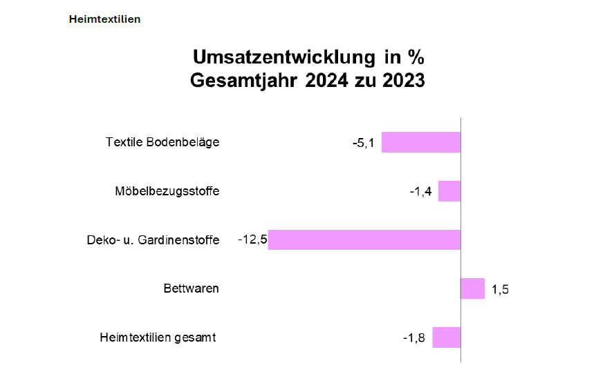 Wie das Kompetenz-Zentrum Textil + Sonnenschutz mitteilt, haben die Hersteller von Heimtextilien für das Geschäftsjahr 2024 ein Umsatzminus von -1,8 % zu beklagen. Bei textilen Bodenbelägen war die Kaufzurückhaltung zu spüren mit -2,6 % im Absatz und -5,1 % im Umsatz. Deko- und Gardinenstoffe waren die größten Verlierer (-18,1 % Absatz, -12,5 % Umsatz). Möbelbezugsstoffe waren hingegen verstärkt nachgefragt (+2,7 % Absatz), jedoch mit rückläufigem Umsatz (-1,4 %). Bettwaren konnten als einzige Sparte Zuwächse bei Absatz (+15,8 %) und Umsatz (+1,5 %) erzielen.