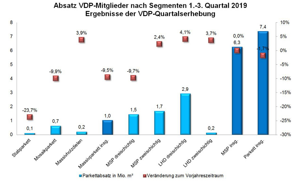 Nach einem leichten Plus im ersten Halbjahr 2019 von 0,1 Prozent sank der Parkettabsatz im dritten Quartal um 5,4 Prozent. „Nach wie vor macht unserer Branche eine schwierige Markt- und Konkurrenzlage zu schaffen. Angesichts des sich abschwächenden gesamtwirtschaftlichen Wachstums und der rückläufigen Baugenehmigungen geht die Nachfrage nach Parkettprodukten aktuell leicht zurück“, erklärt der vdp-Vorsitzende Michael Schmid .