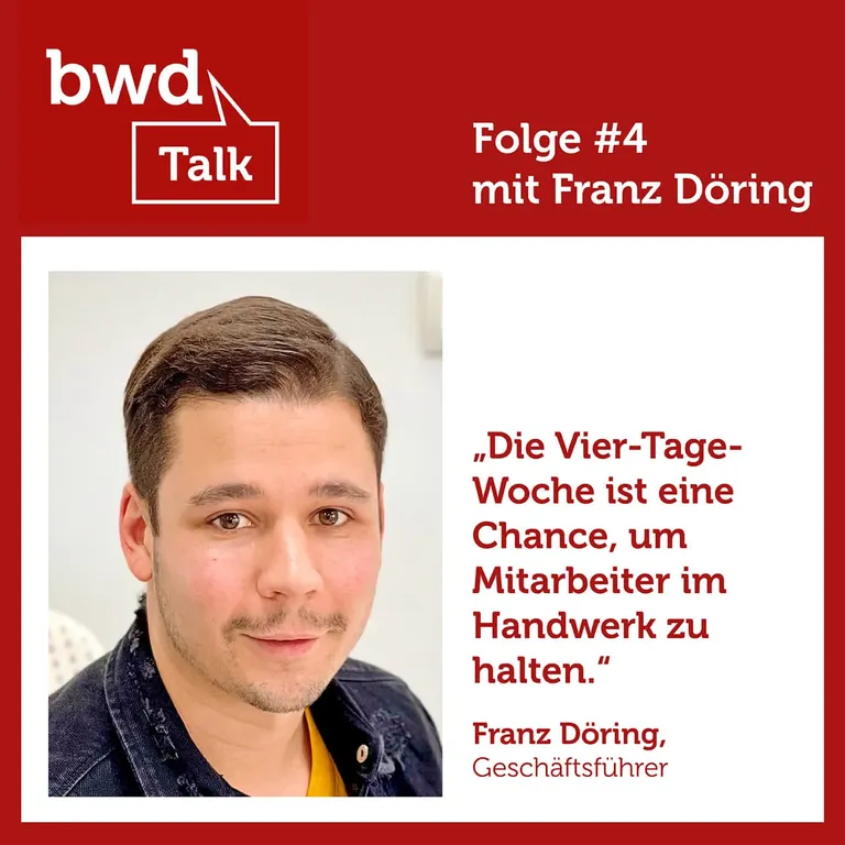 Im bwd talk spricht Franz Döring darüber, wie die Umstellung auch bei Ihnen im Betrieb gelingen kann und warum die Vier-Tage-Woche als große Chance für das Handwerk zu bewerten ist. Hier hören Sie die ganze Folge.