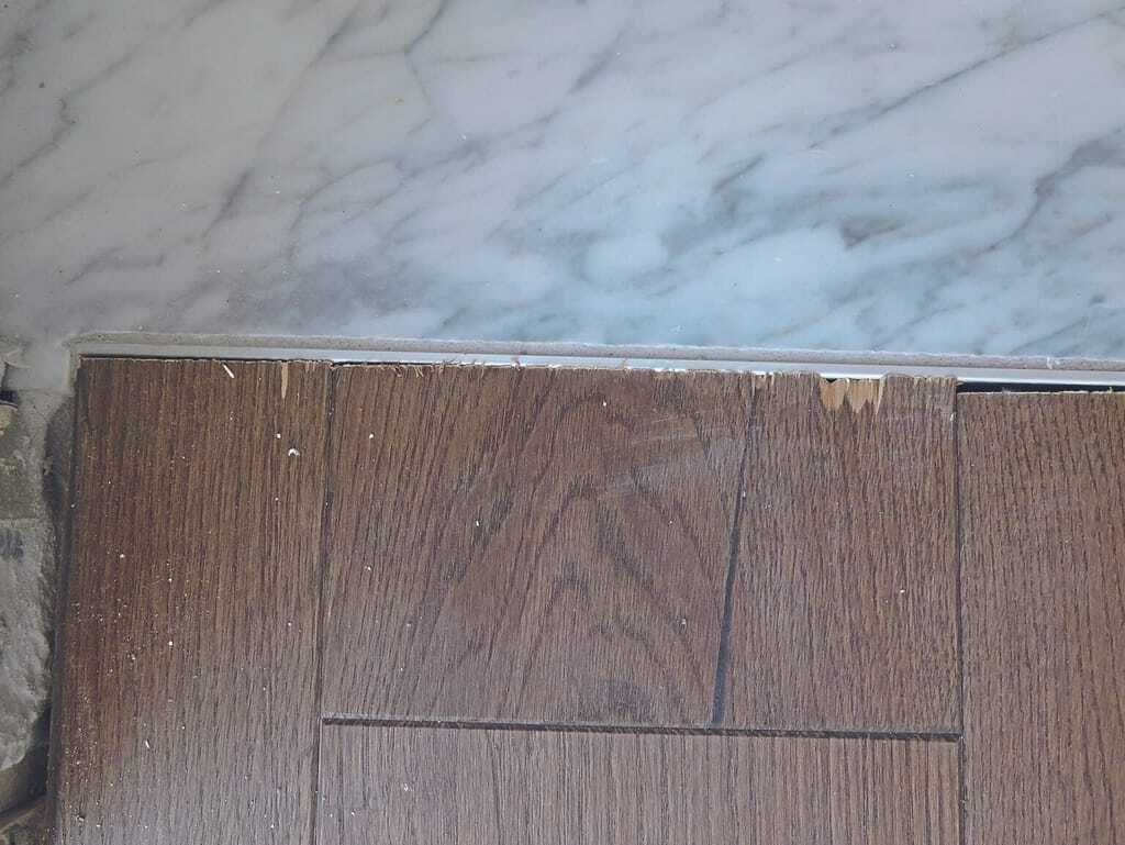 • Anschlüsse: Gegen die Metallabschlussschienen der Marmorbodenflächen hin stand das Parkett dem Profil an. Eine Anschlussfuge lag nicht vor. Dazu wiesen die Schnittkanten am Holz Ausfransungen und weitere Unregelmäßigkeiten auf (vgl. Abb. 2).
