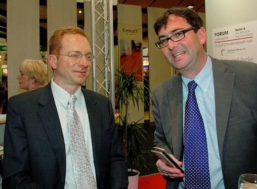 6 „Was passiert mit Armstrong DLW nach dem Verkauf der Textilsparte?“ Auf die Frage, ob sich Tarkett nun Armstrong einverleibt, bekam ’bwd‘-Chefredakteur Stefan Heinze (rechts) von Armstrong-CEO Dave Randich beim Gespräch auf dem ’bwd‘-Stand als Antwort ein klares „Nein“.