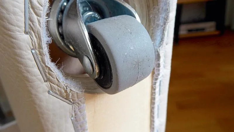 Der Sachverständige wandte sich daraufhin der Couch zu und stellte diese ein Stück zur Seite. An der Vorderseite kamen große Gleiter aus Hartplastik zum Vorschein, an der Rückseite waren Rollen aus demselben Material wie unter den Sesseln angebracht. Unter den Rollen hatten sich bereits dunkle Flecken gebildet, die deutlich größer ausfielen als die Rollenbreite.