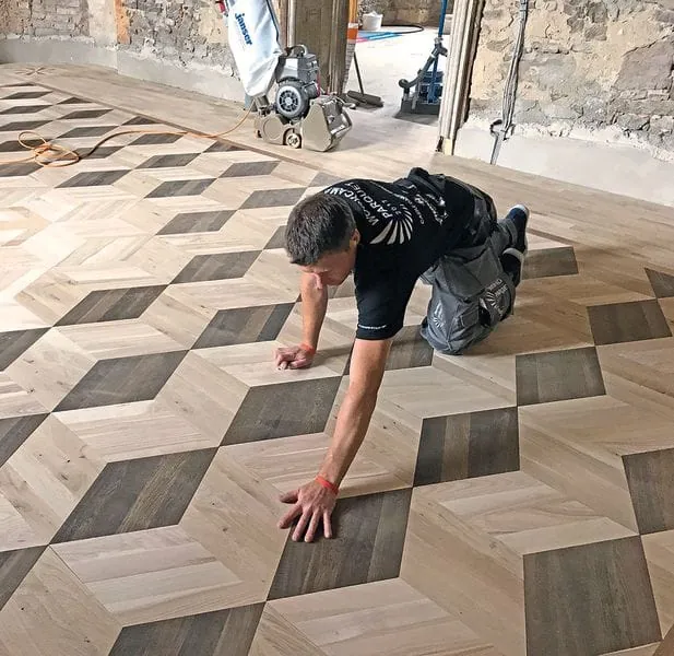 Carans neuer Mitarbeiter ist einer der 35 Parkettleger, die in Dahlen zusammenkamen, um in wenigen Tagen ein außergewöhnliches Parkett im Versailler Muster zu verlegen. Unter den Helfern waren Deutsche genauso wie Engländer, Italiener, Polen, Holländer und Russen. Fast die Hälfte der Teilnehmer erfuhr durch Facebook von dem Projekt, der Rest durch Hörensagen.