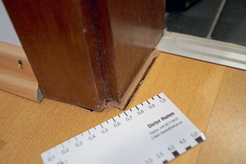 Als sich bei der Kontrolle der Randbereiche auch noch eine deutliche Schwindung an den Türstöcken erkennen lässt, wird klar, dass sogar das Gegenteil der Fall ist und das Parkett flächig geschwunden ist.