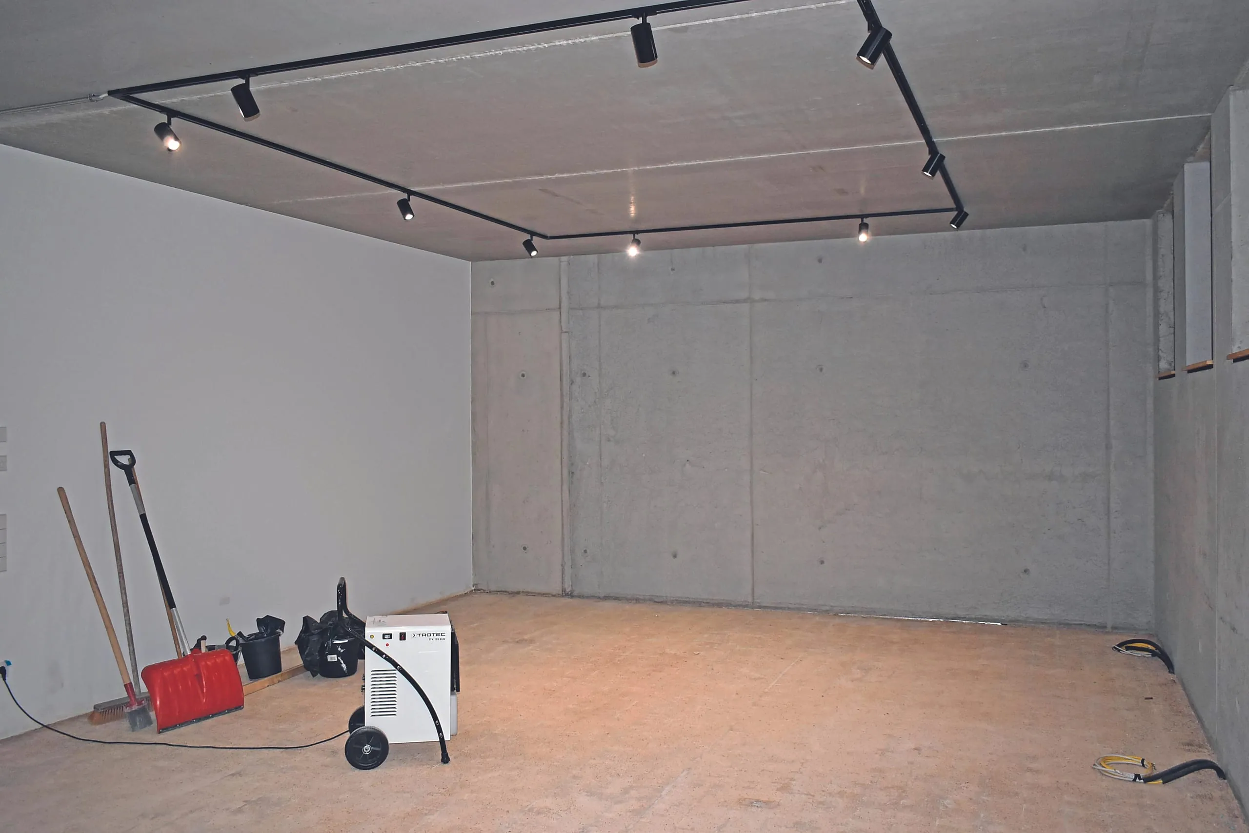 Blick in das Untergeschoss nach Wasserschaden und Trocknung vom Estrich im Pausenraum, Flurbereich und Lager. - © iba-Institut