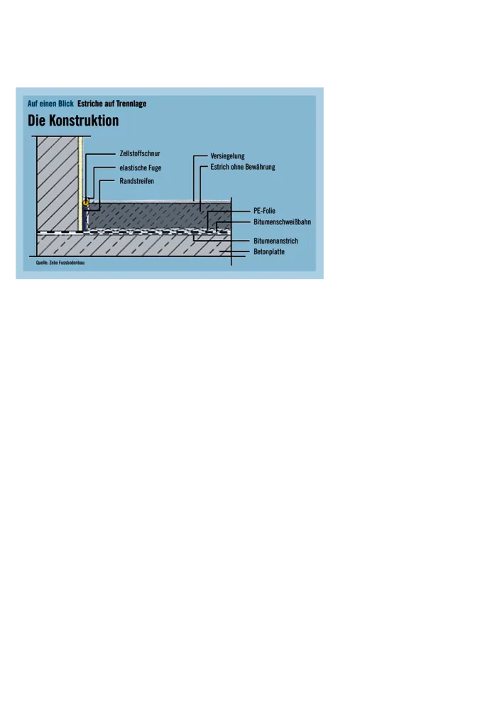 Die Lagen der Trennschicht sollten möglichst glatt und ohne Aufwerfungen verlegt werden. Die Trennlage sollte generell in ungefaltetem Zustand eingesetzt werden, gerade bei fließfähigen Estrichen bleibt beim Entfalten meist eine Sollbruchstelle im Bereich der Faltkante zurück. Wie aber sieht die Praxis aus? Welche Anforderungen sind an den Estrich zu stellen? Für Estriche gibt es eine Vielzahl von Richtlinien und Normen: